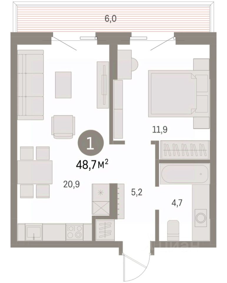 Однокомнатная квартира с предчистовой отделкой в ЖК "Дом Кино" на 7 этаже. Общая площадь: 48.69 кв.м., жилая: 11.9 кв.м., площадь просторной кухни-гостиной: 20.9 кв.м. Все окна выходят на одну сторону. В квартире один балкон, один совмещенный санузел. Высота потолков 2.7 м.