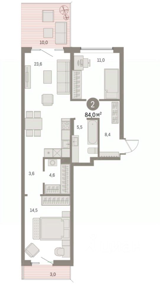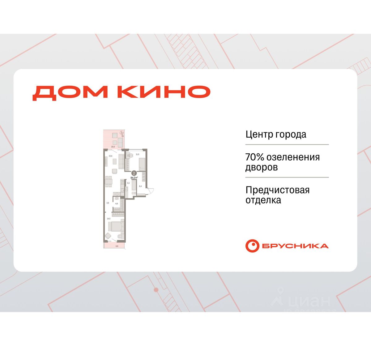 2-комн. квартира от застройщика с предчистовой отделкой в ЖК "Дом Кино" на 2 этаже. Общая площадь: 83.98 кв.м., жилая: 25.5 кв.м., площадь просторной кухни-гостиной: 23.6 кв.м. Квартира - распашонка, без проходных комнат, окна выходят на paзные стороны дома. В квартире два балкона, один совмещенный санузел. Терраса представляет собой роскошную зону отдыха для проведение вечеров в кругу семьи и друзей или организация вечеринок. Высота потолков 2.7 м.