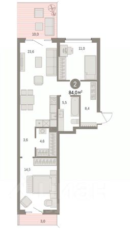 Квартира с кухней-гостиной и двумя спальнями в Доме кино. Особенности планировки: окна на две стороны, вид во двор, разнесённые спальни, предчистовая отделка, мастер-спальня, терраса, постирочная, балкон.