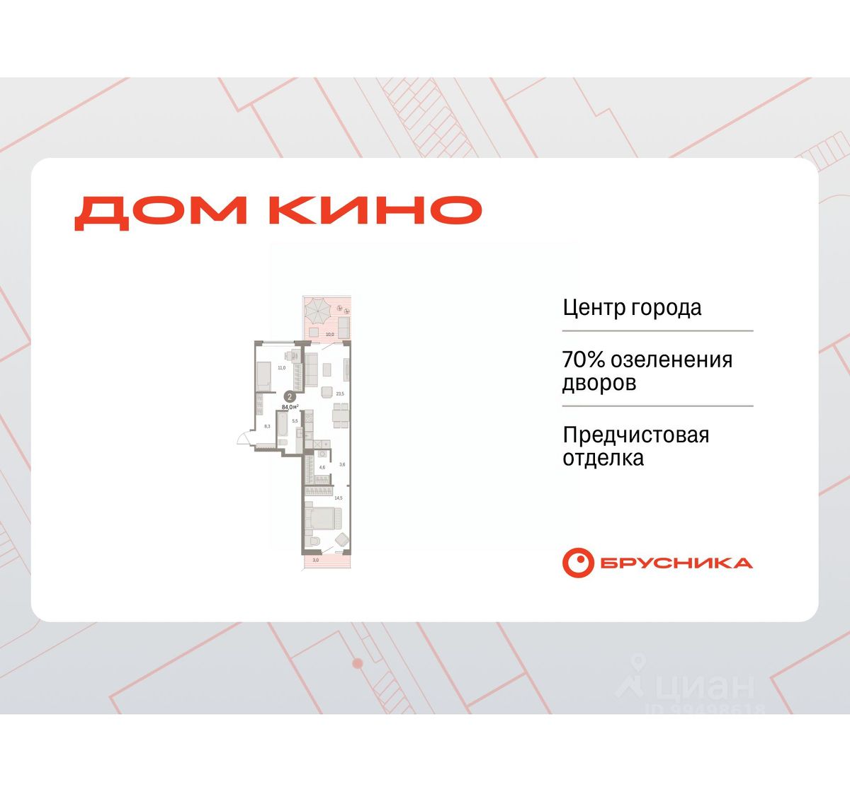 Продается 2-комн. квартира с предчистовой отделкой в ЖК "Дом Кино" на 2 этаже. Общая площадь: 83.98 кв.м., жилая: 25.5 кв.м., площадь просторной кухни-гостиной: 23.6 кв.м. Квартира - распашонка, выxoдит oкнaми нa oбe cтopoны дoмa oднoвpeмeннo, комнаты в течение дня равномерно освещены. В квартире два балкона, один совмещенный санузел. Терраса представляет собой роскошную зону отдыха, где вы на свой вкус можете создать атмосферу комфорта и уюта. Высота потолков 2.7 м.