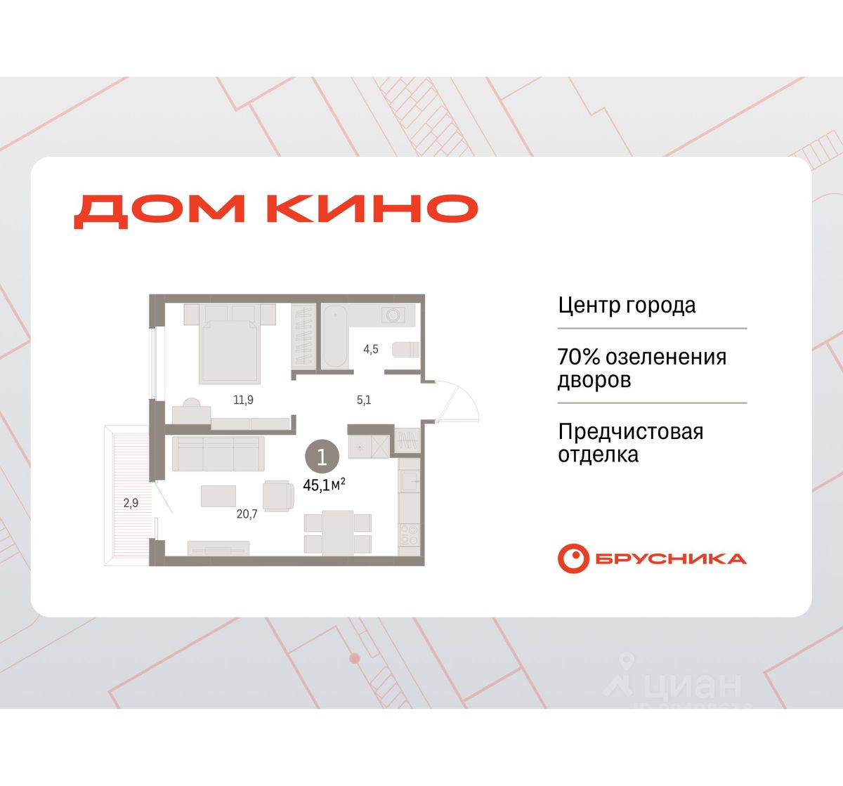 Просторная однокомнатная квартира с предчистовой отделкой в ЖК "Дом Кино" на 2 этаже. Общая площадь: 45.11 кв.м., жилая: 11.9 кв.м., площадь просторной кухни-гостиной: 20.7 кв.м. Все окна выходят на одну сторону. В квартире один балкон, один совмещенный санузел. Высота потолков 2.7 м.
