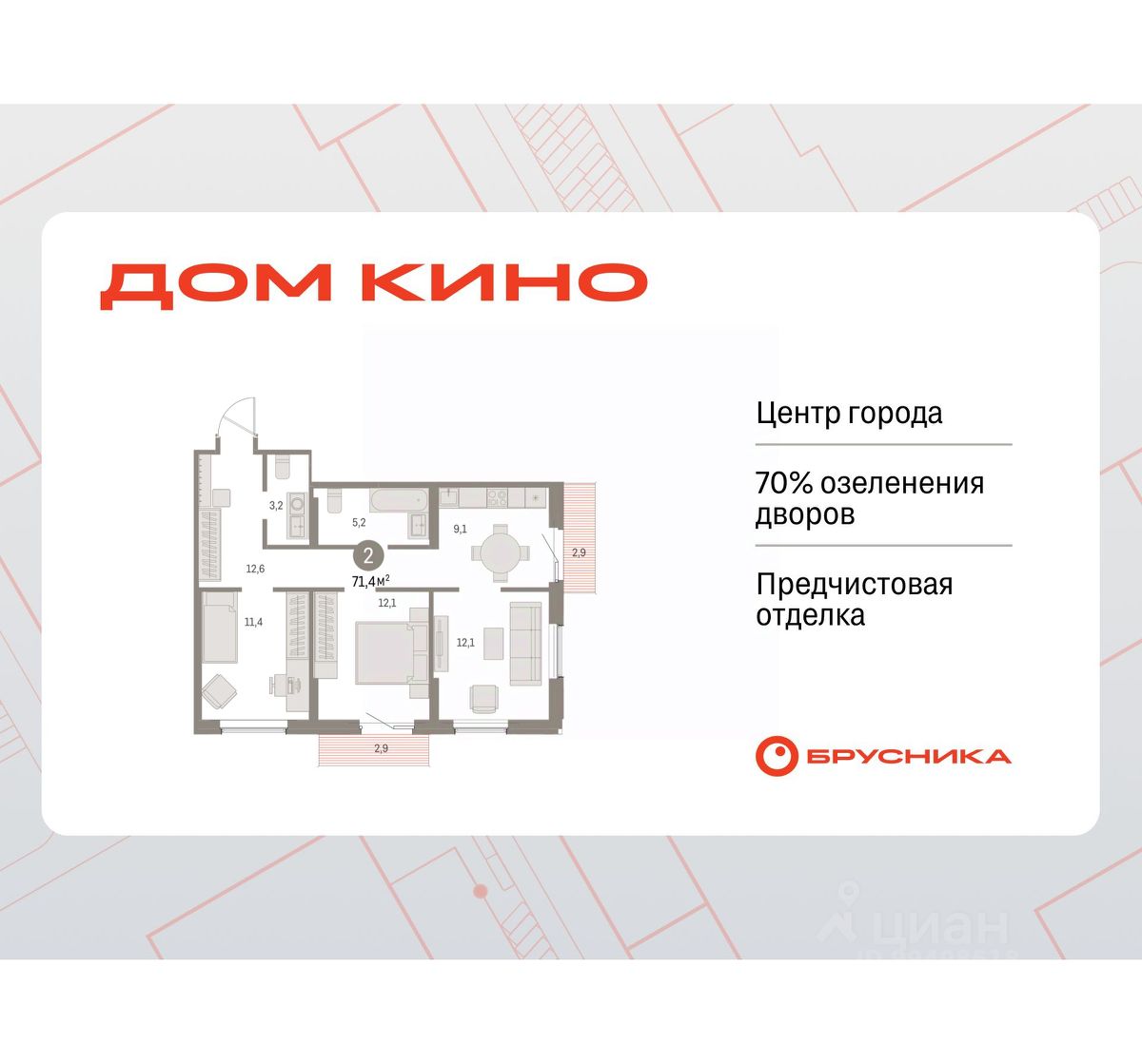 Продается двухкомнатная квартира с предчистовой отделкой в ЖК "Дом Кино" на 6 этаже. Общая площадь: 71.37 кв.м., жилая: 23.5 кв.м., площадь просторной кухни-гостиной: 21.2 кв.м. Угловая квартира, идеально подойдет любителям тишины и панорамных видов. В квартире два балкона, один совмещенный и один раздельный санузел. Высота потолков 2.7 м.