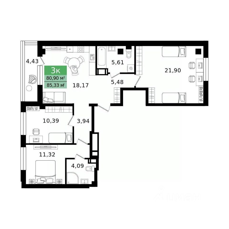 Общая площадь85,33 м²