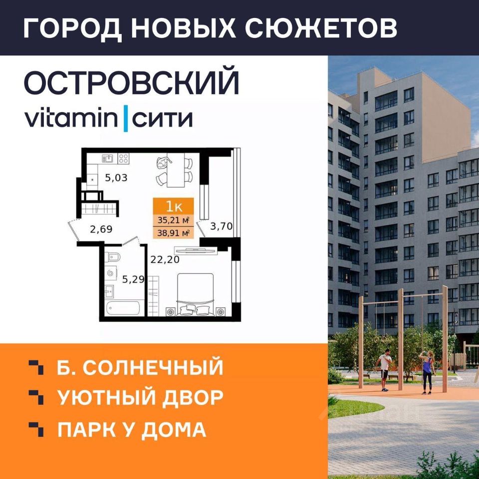 "Островский vitamin-сити" — город новых сюжетов на бульваре Солнечном Масштабный проект комплексной застройки территории в динамично развивающемся районе Кургана, вблизи парка "Царёво городище". На территории комплекса запланированы жилые дома с уникальными планировками, благоустроенные дворы без машин, просторные парковки, прогулочные зоны и полноценная инфраструктура для всей семьи. Почему выбирают ЖК "Островский vitamin-сити"? Уникальная локация: жилой комплекс расположен в тихом и живописном месте, всего в 10 минутах от центра города. Парк "Семи островов": визитной карточкой проекта станет уникальное пространство площадью более 2,5 Га для прогулок и тренировок на свежем воздухе в шаговой доступности от дома. Дворы нового уровня: полностью безопасные, с игровыми элементами, разработанными по методике нейрофизиологов, богатым озеленением и удобными зонами отдыха для всей семьи. Надежность и качество: дома строятся по технологии КУБ 2,5, обеспечивающей надежность, долговечность и высокую энергоэффективность. Фасады домов выполнены в стильных натуральных природных оттенках. Не просто подъезды: в холлах зоны ожидания, колясочные, лапомойки и комнаты гигиены. Благодаря прозрачным входным группам в подъездах всегда будет светло и просторно. Продуманные планировки: вы можете подобрать квартиру, которая подходит именно вам сити-хаусы, квартиры-трансформеры, отсутствие несущих стен дают возможности для разных сценариев жизни. Выбор отделки: квартиры сдаются в предчистовой отделке, которая включает оштукатуренные стены, стяжку пола, установленные радиаторы отопления и окна ПВХ, электропроводку до квартирного щитка, выделенные мокрые зоны в санузлах. Также есть возможность приобрести чистовую отделку, включив её стоимость в ипотеку. Условия покупки: Действует беспроцентная рассрочка, а также выгодные спецпредложения и акции! Сроки сдачи: Первая очередь ЖК "Островский" будет сдана во II квартале 2027 года.