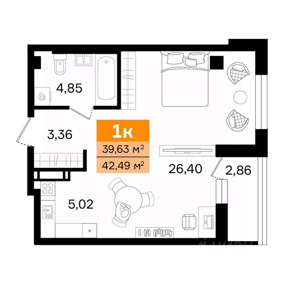 Общая площадь42,49 м²