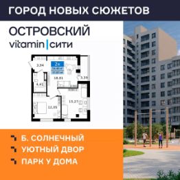 "Островский vitamin-сити" — город новых сюжетов на бульваре Солнечном Масштабный проект комплексной застройки территории в динамично развивающемся районе Кургана, вблизи парка "Царёво городище". На территории комплекса запланированы жилые дома с уникальными планировками, благоустроенные дворы без машин, просторные парковки, прогулочные зоны и полноценная инфраструктура для всей семьи. Почему выбирают ЖК "Островский vitamin-сити"? Уникальная локация: жилой комплекс расположен в тихом и живописном месте, всего в 10 минутах от центра города. Парк "Семи островов": визитной карточкой проекта станет уникальное пространство площадью более 2,5 Га для прогулок и тренировок на свежем воздухе в шаговой доступности от дома. Дворы нового уровня: полностью безопасные, с игровыми элементами, разработанными по методике нейрофизиологов, богатым озеленением и удобными зонами отдыха для всей семьи. Надежность и качество: дома строятся по технологии КУБ 2,5, обеспечивающей надежность, долговечность и высокую энергоэффективность. Фасады домов выполнены в стильных натуральных природных оттенках. Не просто подъезды: в холлах зоны ожидания, колясочные, лапомойки и комнаты гигиены. Благодаря прозрачным входным группам в подъездах всегда будет светло и просторно. Продуманные планировки: вы можете подобрать квартиру, которая подходит именно вам сити-хаусы, квартиры-трансформеры, отсутствие несущих стен дают возможности для разных сценариев жизни. Выбор отделки: квартиры сдаются в предчистовой отделке, которая включает оштукатуренные стены, стяжку пола, установленные радиаторы отопления и окна ПВХ, электропроводку до квартирного щитка, выделенные мокрые зоны в санузлах. Также есть возможность приобрести чистовую отделку, включив её стоимость в ипотеку. Условия покупки: Действует беспроцентная рассрочка, а также выгодные спецпредложения и акции! Сроки сдачи: Первая очередь ЖК "Островский" будет сдана во II квартале 2027 года.