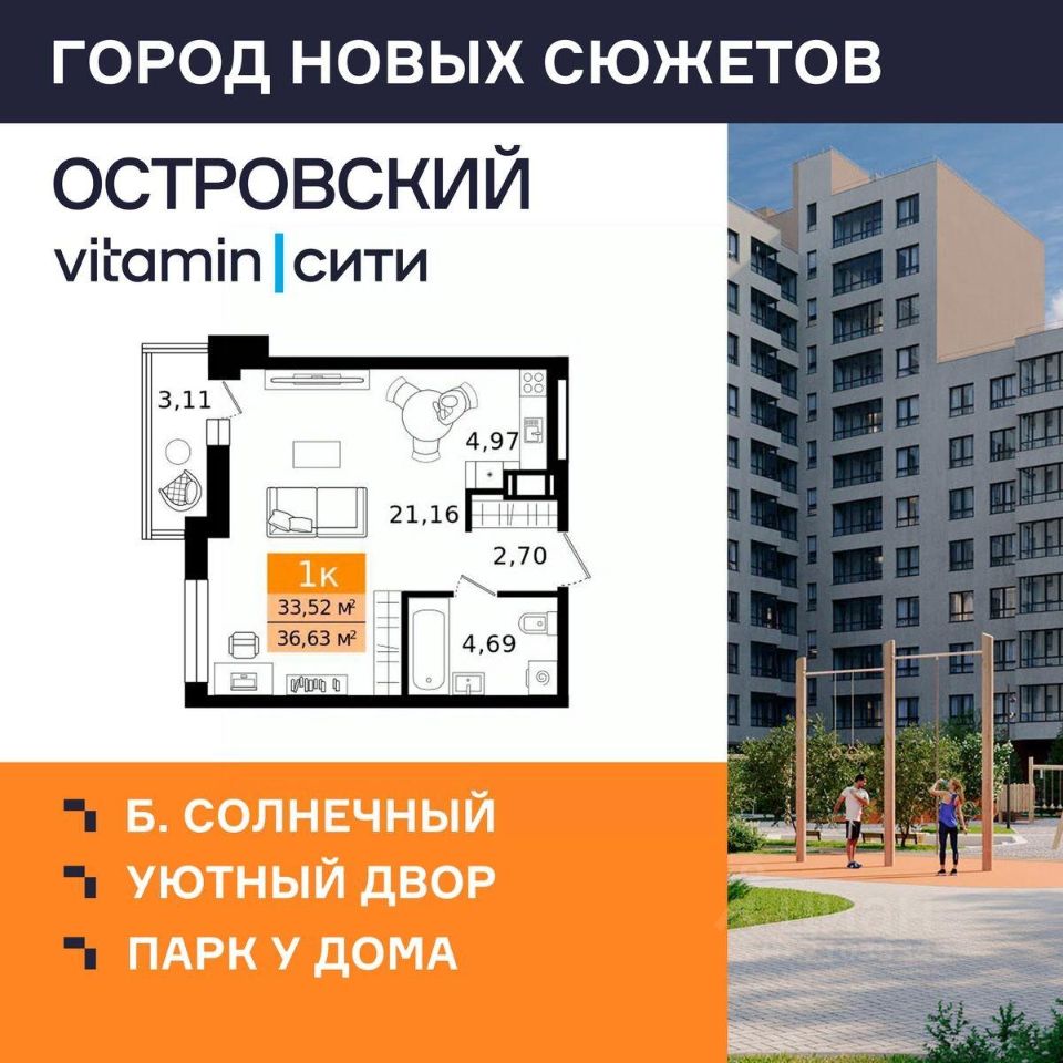 "Островский vitamin-сити" — город новых сюжетов на бульваре Солнечном Масштабный проект комплексной застройки территории в динамично развивающемся районе Кургана, вблизи парка "Царёво городище". На территории комплекса запланированы жилые дома с уникальными планировками, благоустроенные дворы без машин, просторные парковки, прогулочные зоны и полноценная инфраструктура для всей семьи. Почему выбирают ЖК "Островский vitamin-сити"? Уникальная локация: жилой комплекс расположен в тихом и живописном месте, всего в 10 минутах от центра города. Парк "Семи островов": визитной карточкой проекта станет уникальное пространство площадью более 2,5 Га для прогулок и тренировок на свежем воздухе в шаговой доступности от дома. Дворы нового уровня: полностью безопасные, с игровыми элементами, разработанными по методике нейрофизиологов, богатым озеленением и удобными зонами отдыха для всей семьи. Надежность и качество: дома строятся по технологии КУБ 2,5, обеспечивающей надежность, долговечность и высокую энергоэффективность. Фасады домов выполнены в стильных натуральных природных оттенках. Не просто подъезды: в холлах зоны ожидания, колясочные, лапомойки и комнаты гигиены. Благодаря прозрачным входным группам в подъездах всегда будет светло и просторно. Продуманные планировки: вы можете подобрать квартиру, которая подходит именно вам сити-хаусы, квартиры-трансформеры, отсутствие несущих стен дают возможности для разных сценариев жизни. Выбор отделки: квартиры сдаются в предчистовой отделке, которая включает оштукатуренные стены, стяжку пола, установленные радиаторы отопления и окна ПВХ, электропроводку до квартирного щитка, выделенные мокрые зоны в санузлах. Также есть возможность приобрести чистовую отделку, включив её стоимость в ипотеку. Условия покупки: Действует беспроцентная рассрочка, а также выгодные спецпредложения и акции! Сроки сдачи: Первая очередь ЖК "Островский" будет сдана во II квартале 2027 года.