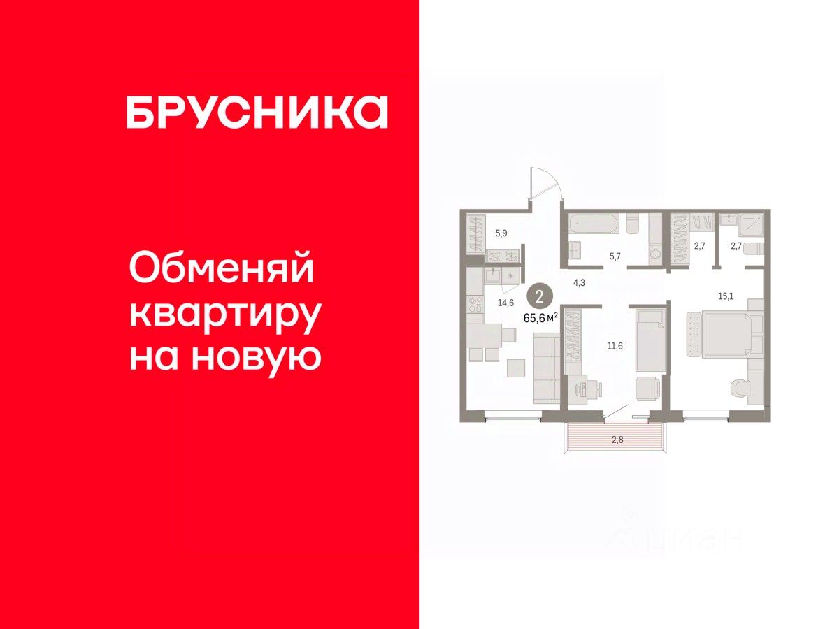 2-комн. квартира с предчистовой отделкой в ЖК "Дом Кино" на 9 этаже. Общая площадь: 65.59 кв.м., жилая: 26.7 кв.м., площадь просторной кухни-гостиной: 14.6 кв.м. Комнаты изолированные, все окна выходят на одну сторону. В квартире один балкон, два совмещенных санузла. Высота потолков 2.7 м.