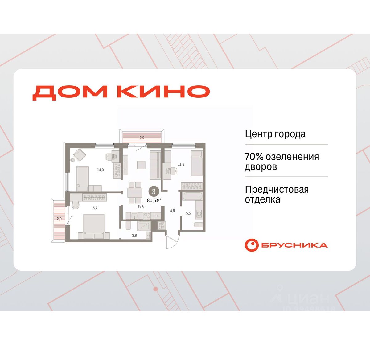 Трехкомнатная квартира с предчистовой отделкой в ЖК "Дом Кино" на 3 этаже. Общая площадь: 80.47 кв.м., жилая: 41.9 кв.м., площадь просторной кухни-гостиной: 18.6 кв.м. Угловая квартира, идеально подойдет любителям тишины и панорамных видов. В квартире два балкона, два совмещенных санузла. Высота потолков 2.7 м.