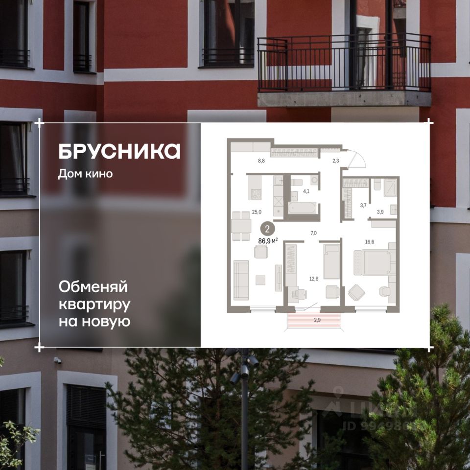 2-комн. квартира от застройщика с предчистовой отделкой в ЖК "Дом Кино" на 3 этаже. Общая площадь: 86.89 кв.м., жилая: 29.2 кв.м., площадь просторной кухни-гостиной: 25 кв.м. Комнаты изолированные, все окна выходят на одну сторону. В квартире один балкон, два совмещенных санузла. Высота потолков 2.7 м.