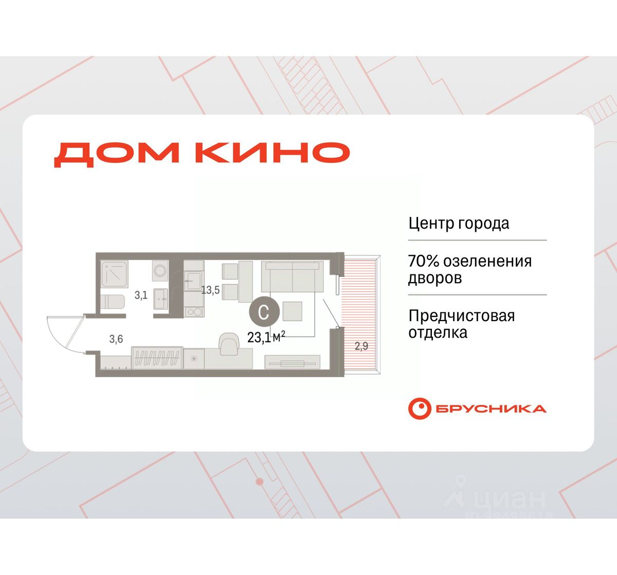 1-комн. студия от застройщика с предчистовой отделкой в ЖК "Дом Кино" на 6 этаже. Общая площадь: 23.06 кв.м., площадь гостиной 13.5 кв.м., из которых 5 кв.м. выделено под кухонную зону. Все окна выходят на одну сторону. В квартире один балкон, один совмещенный санузел. Высота потолков 2.7 м.