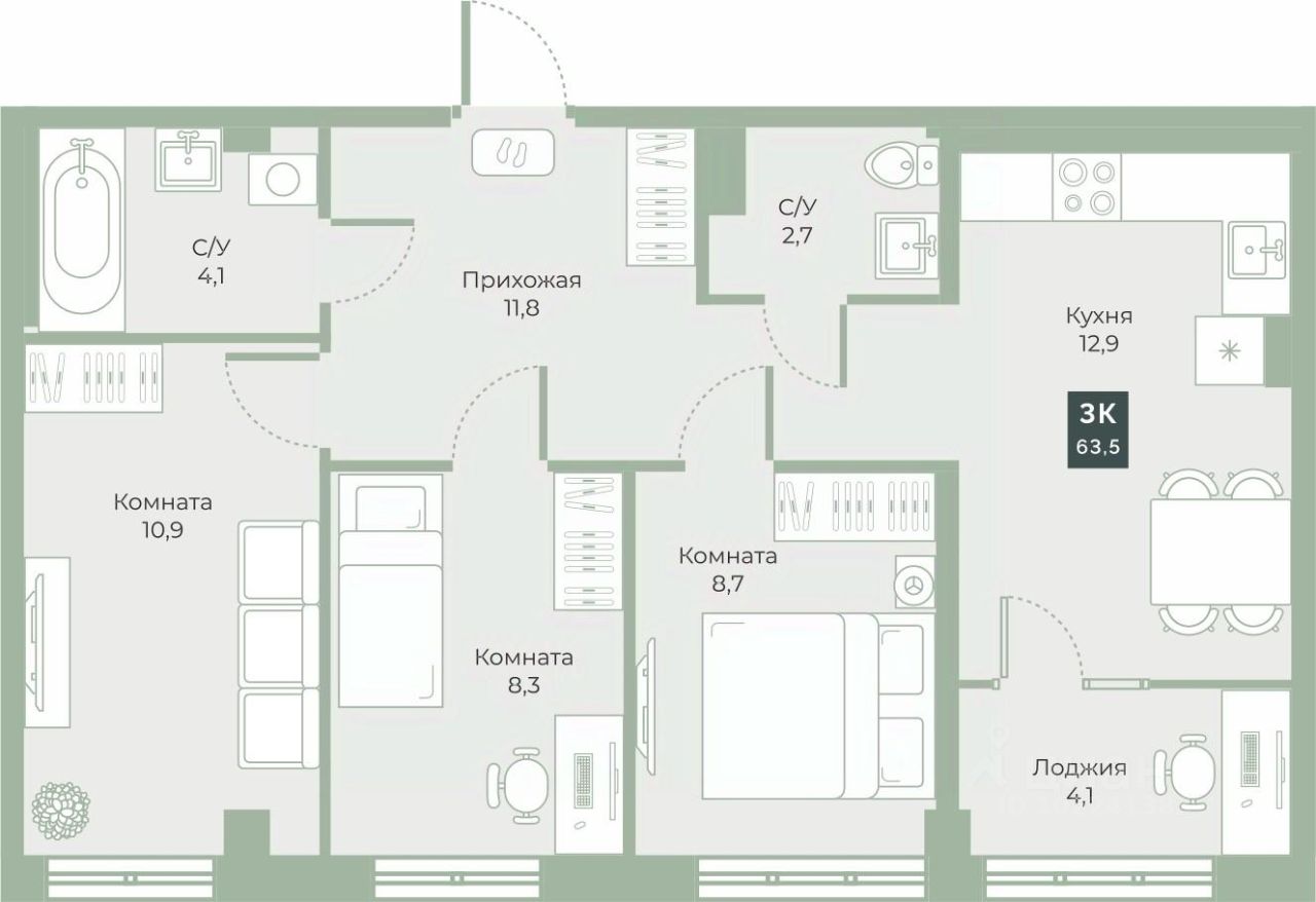 Квартира с предчистовой отделкой, с продуманной функциональной планировкой: кухня-гостиная 12.9м2, жилая площадь 27.9м2, высота потолка 2,76 м.