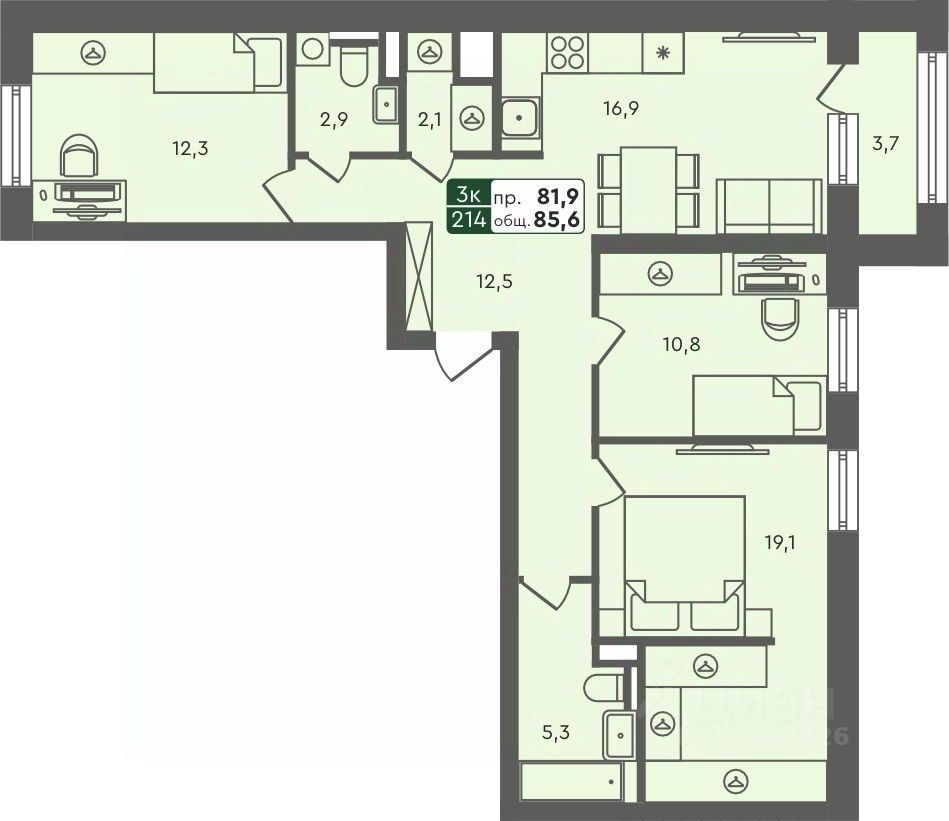 Продаётся 3-комнатная квартира в строящемся доме (ГП-6), срок сдачи: IV-кв. 2025, общей площадью 85.6 кв.м., на 4 этаже. ЖК "Маяк" расположен г. Курган, в северо-западном направлении от центра города в районе озера Черное.