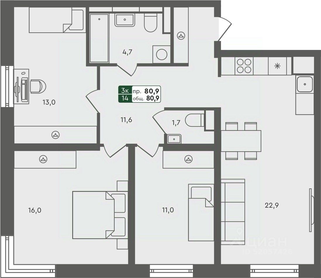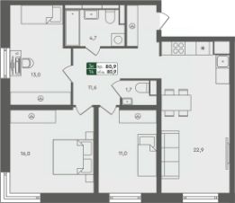 Продаётся 3-комнатная квартира в строящемся доме (ГП-7), срок сдачи: IV-кв. 2025, общей площадью 80.9 кв.м., на 4 этаже. ЖК "Маяк" расположен г. Курган, в северо-западном направлении от центра города в районе озера Черное.