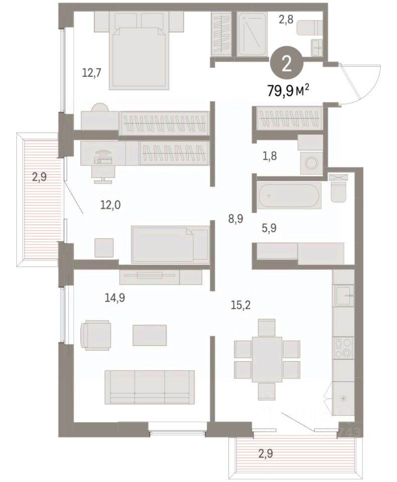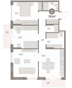 Квартира с кухней-гостиной и двумя спальнями в Доме кино. Особенности планировки: второй санузел, разнесённые спальни, предчистовая отделка, постирочная, балкон.