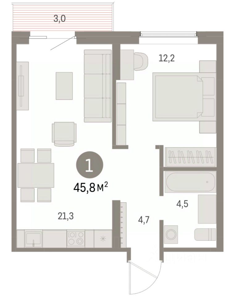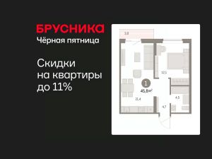 Просторная 1-комн. квартира с предчистовой отделкой в ЖК "Дом Кино" на 9 этаже. Общая площадь: 45.75 кв.м., жилая: 12.2 кв.м., площадь просторной кухни-гостиной: 21.3 кв.м. Все окна выходят на одну сторону. В квартире один балкон, один совмещенный санузел. Высота потолков 2.7 м.