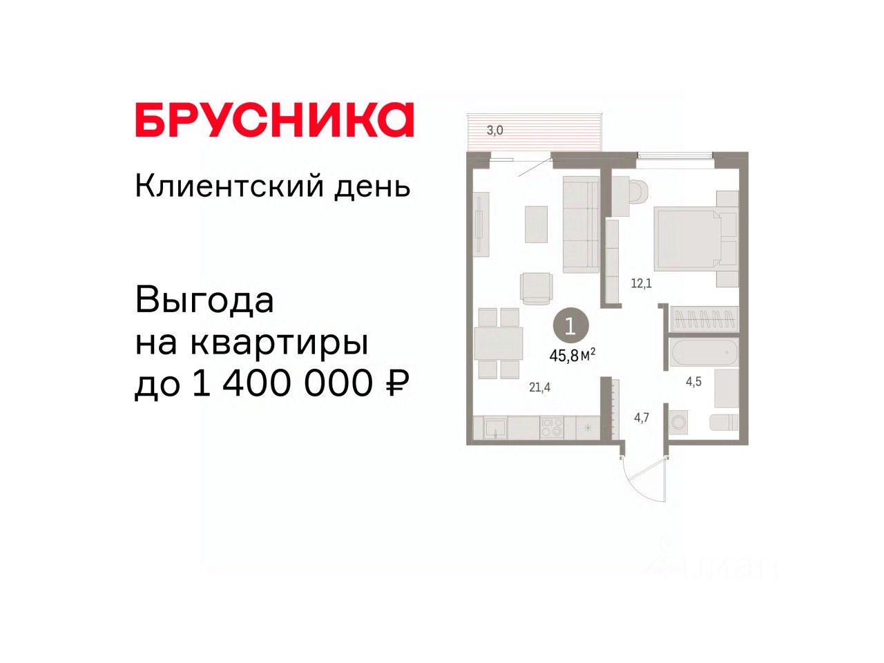 Однокомнатная квартира с предчистовой отделкой в ЖК "Дом Кино" на 9 этаже. Общая площадь: 45.75 кв.м., жилая: 12.2 кв.м., площадь просторной кухни-гостиной: 21.3 кв.м. Все окна выходят на одну сторону. В квартире один балкон, один совмещенный санузел. Высота потолков 2.7 м.