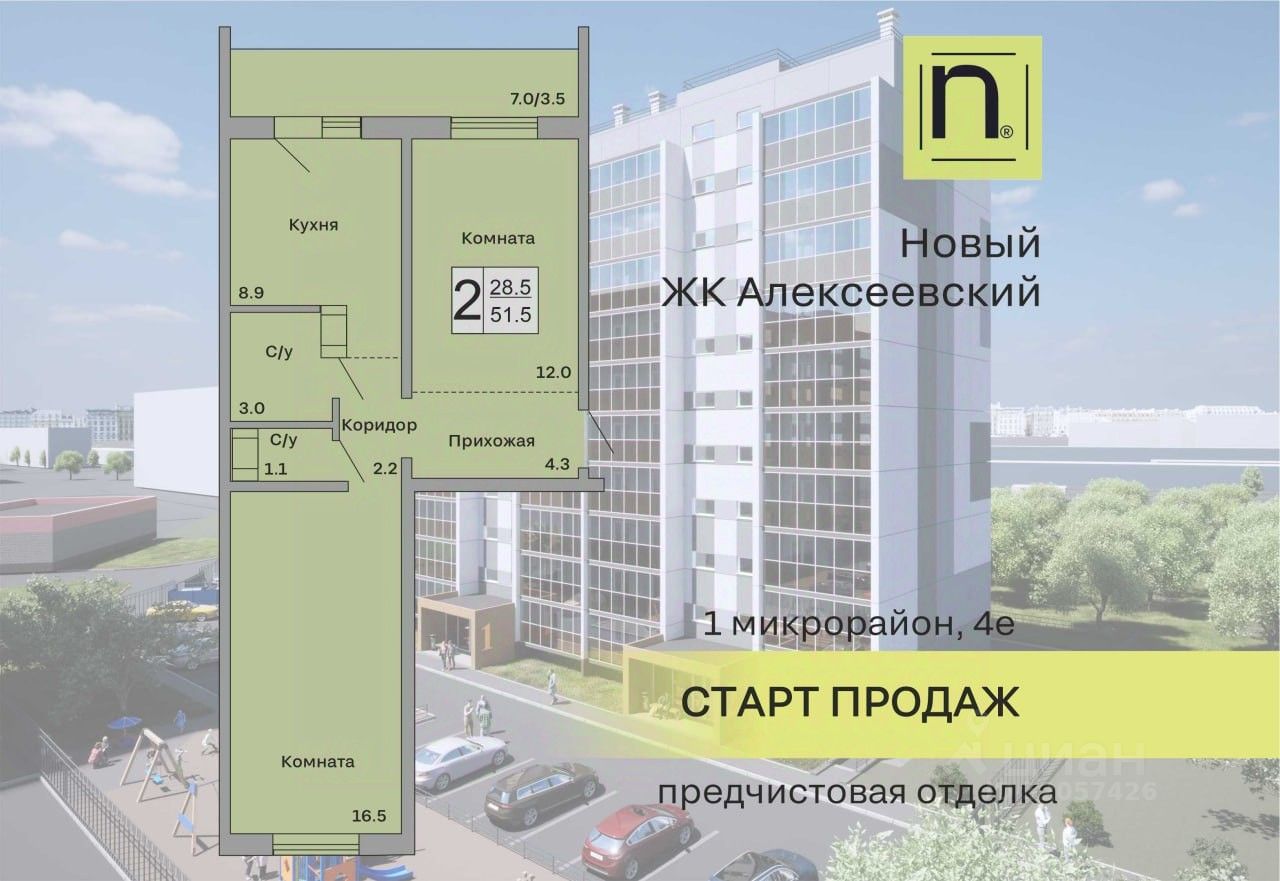 Продаётся 2-комнатная квартира в строящемся доме (Дом 1), срок сдачи: I-кв. 2027, общей площадью 51.5 кв.м., на 5 этаже. Новый жилой комплекс "Алексеевский" от застройщика "ГК Кургансельстрой" расположен по адресу: г. Курган, жилой район Заозёрный, 1-й микрорайон, улица Алексеева.
