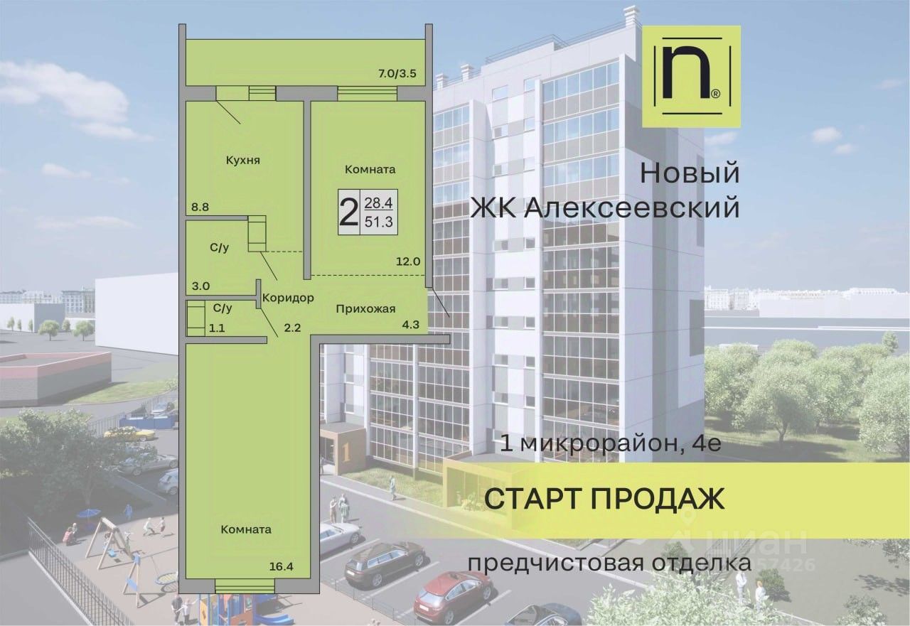 Продаётся 2-комнатная квартира в строящемся доме (Дом 1), срок сдачи: I-кв. 2027, общей площадью 51.3 кв.м., на 4 этаже. Новый жилой комплекс "Алексеевский" от застройщика "ГК Кургансельстрой" расположен по адресу: г. Курган, жилой район Заозёрный, 1-й микрорайон, улица Алексеева.