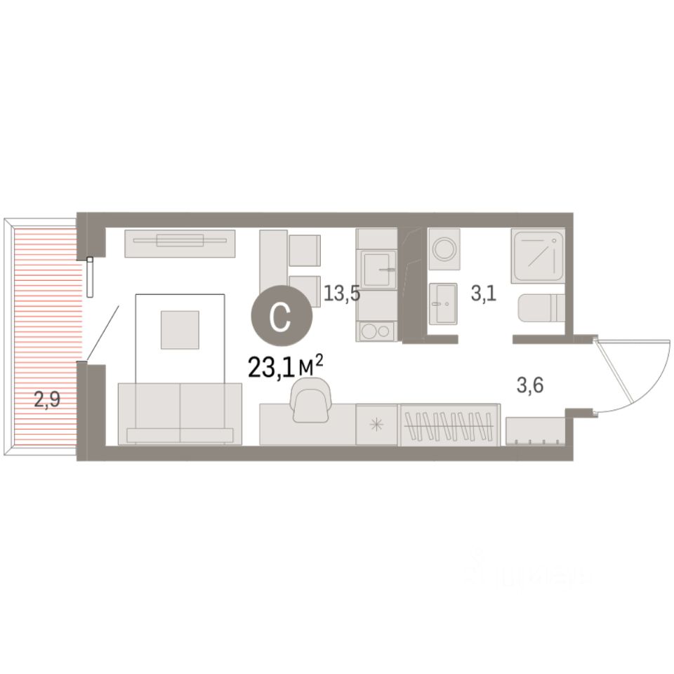 Однокомнатная студия от застройщика с предчистовой отделкой в ЖК "Дом Кино" на 7 этаже. Общая площадь: 23.06 кв.м., площадь гостиной 13.5 кв.м., из которых 5 кв.м. выделено под кухонную зону. Все окна выходят на одну сторону. В квартире один балкон, один совмещенный санузел. Высота потолков 2.7 м.