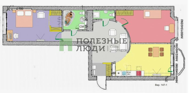 Обширная прихожая, 11 метровая кухня с нишей под кладовку, две изолированные комнаты, расположенные друг против друга и коридор между ними с раздельным санузлом и ремонтом.