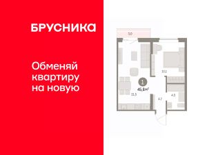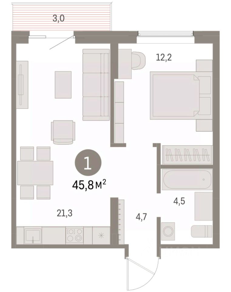 Однокомнатная квартира с предчистовой отделкой в ЖК "Дом Кино" на 8 этаже. Общая площадь: 45.75 кв.м., жилая: 12.2 кв.м., площадь просторной кухни-гостиной: 21.3 кв.м. Все окна выходят на одну сторону. В квартире один балкон, один совмещенный санузел. Высота потолков 2.7 м.