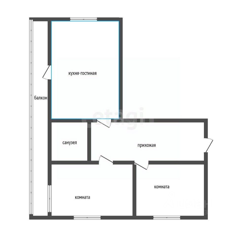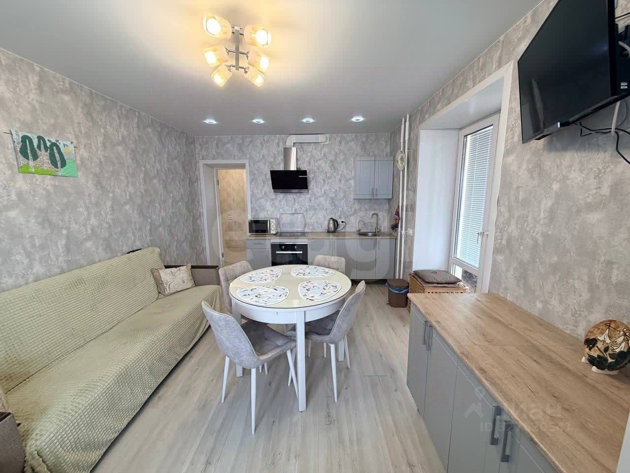 Квартира на 12 этаже, планировка-распашонка с кухней-гостиной и большой основной комнатой, спальней, санузел совмещенный, балкон длиной 12 метров с панорамным остеклением, освещением и ремонтом.