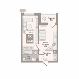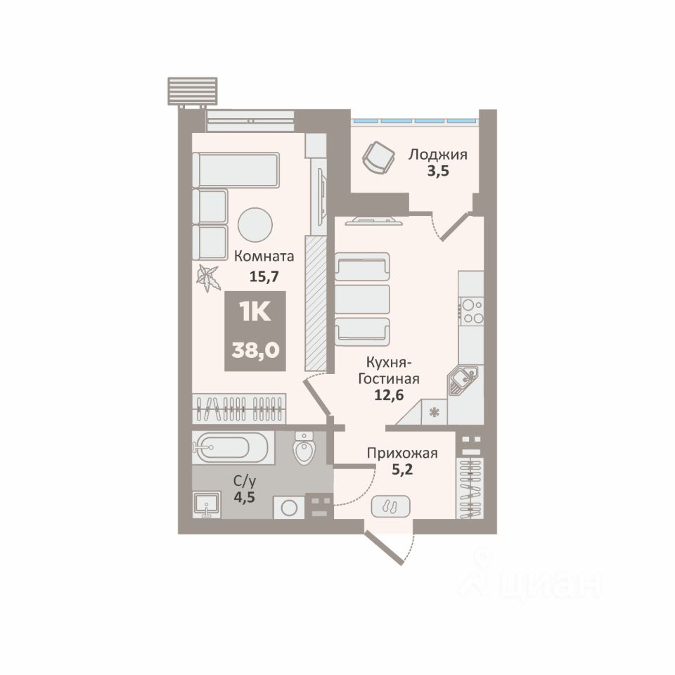 Общая площадь 38 м² включает: