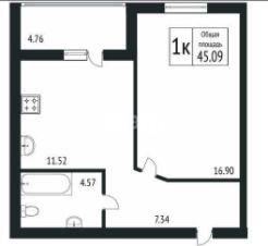Предлагается к продаже квартира свободной планировки, площадью 45,09 кв.метра.