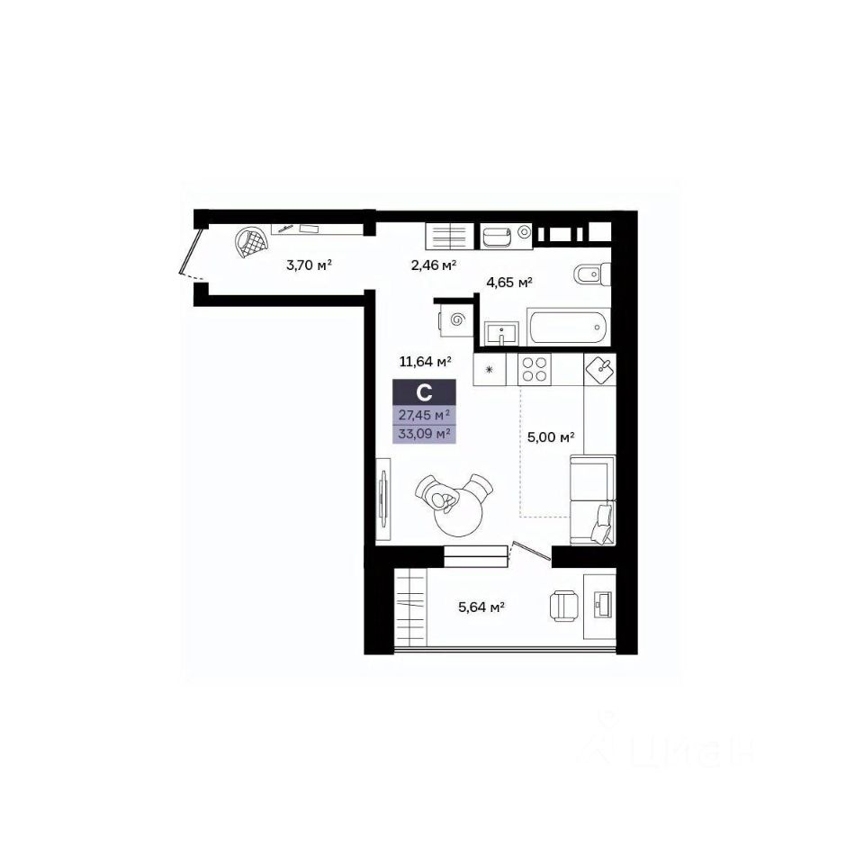 Общая площадь33,09 м²