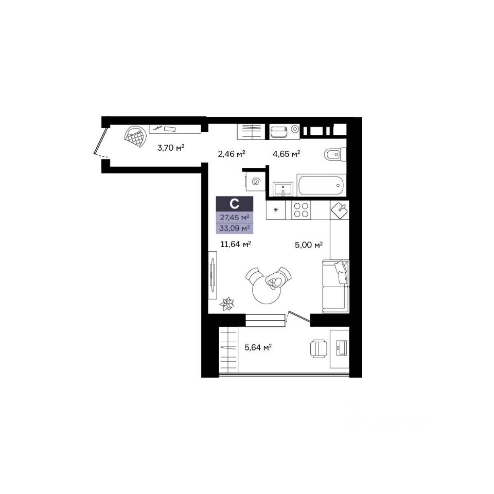 Общая площадь33,09 м²