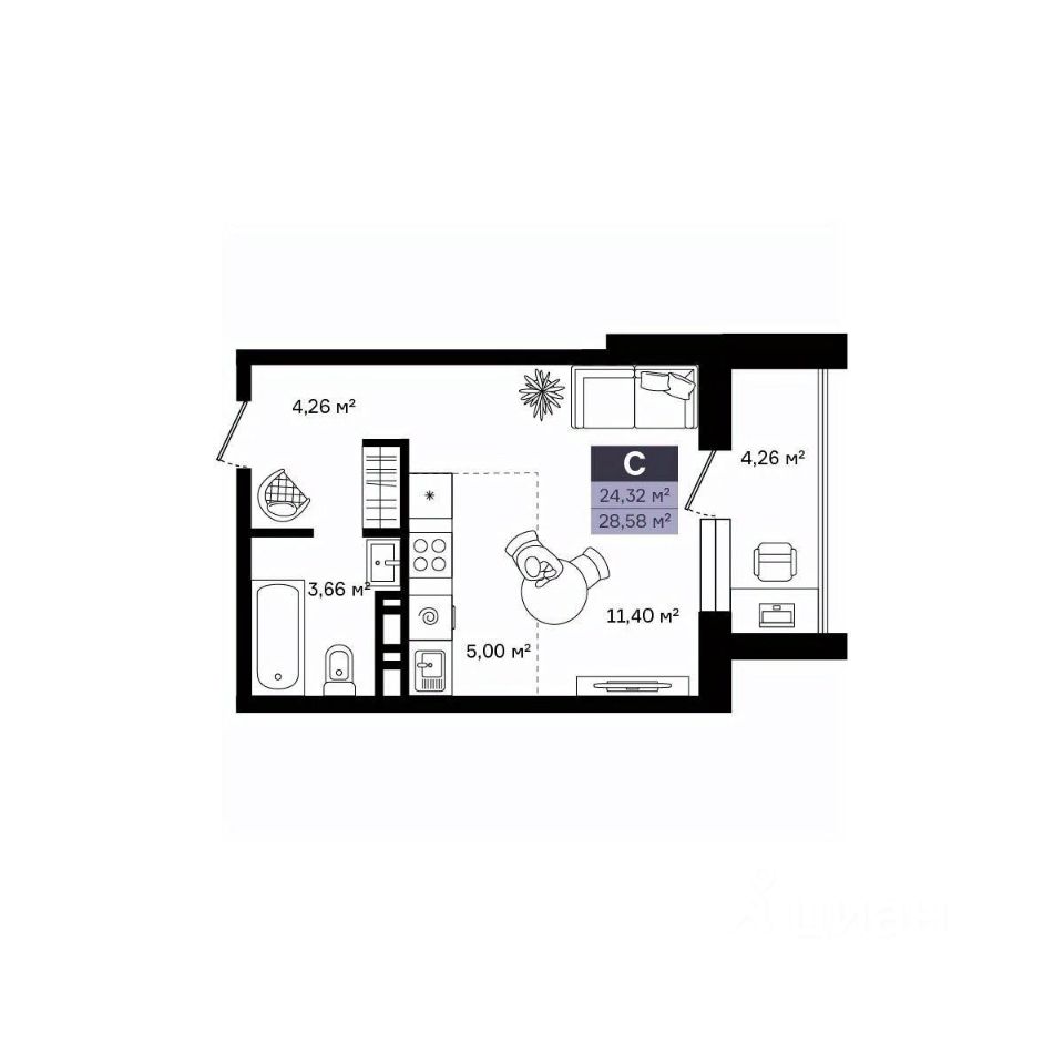 Продается студия, 28,58 м²