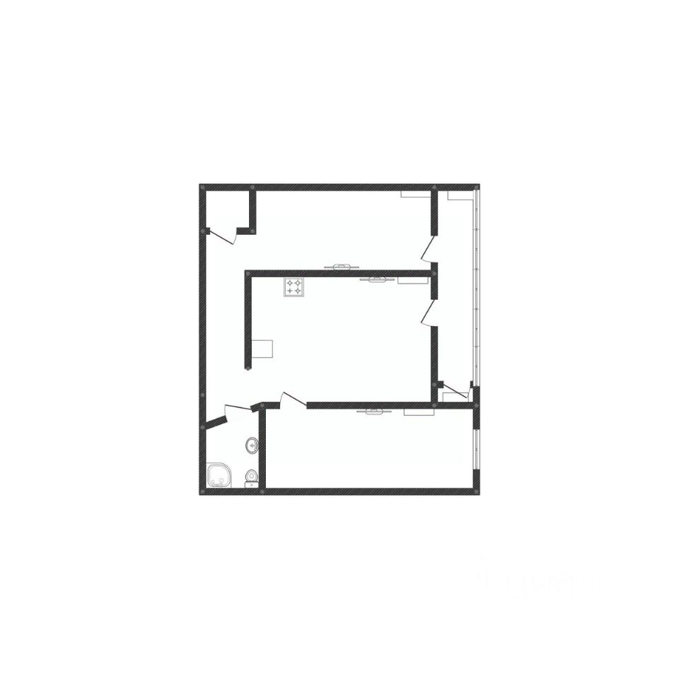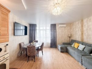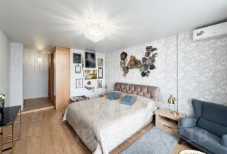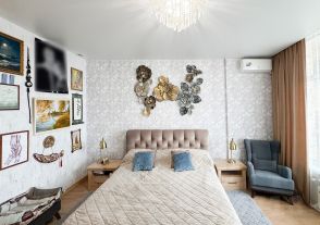 В квартире сделаны две спальни, разделенные разделены широким коридором и большой кухней-гостиной площадью 30 кв. м. с доступом на балкон. Одна спальня также имеет доступ к балкону и каждая имеет доступ к собственному санузлу (Один санузел переделан в кладовую).