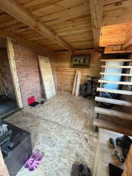 Новая деревянная отделка. Кирпичная основа под печь. Удобные полки, вентиляция и естественный свет. Подготовленная зона под душ или купель.