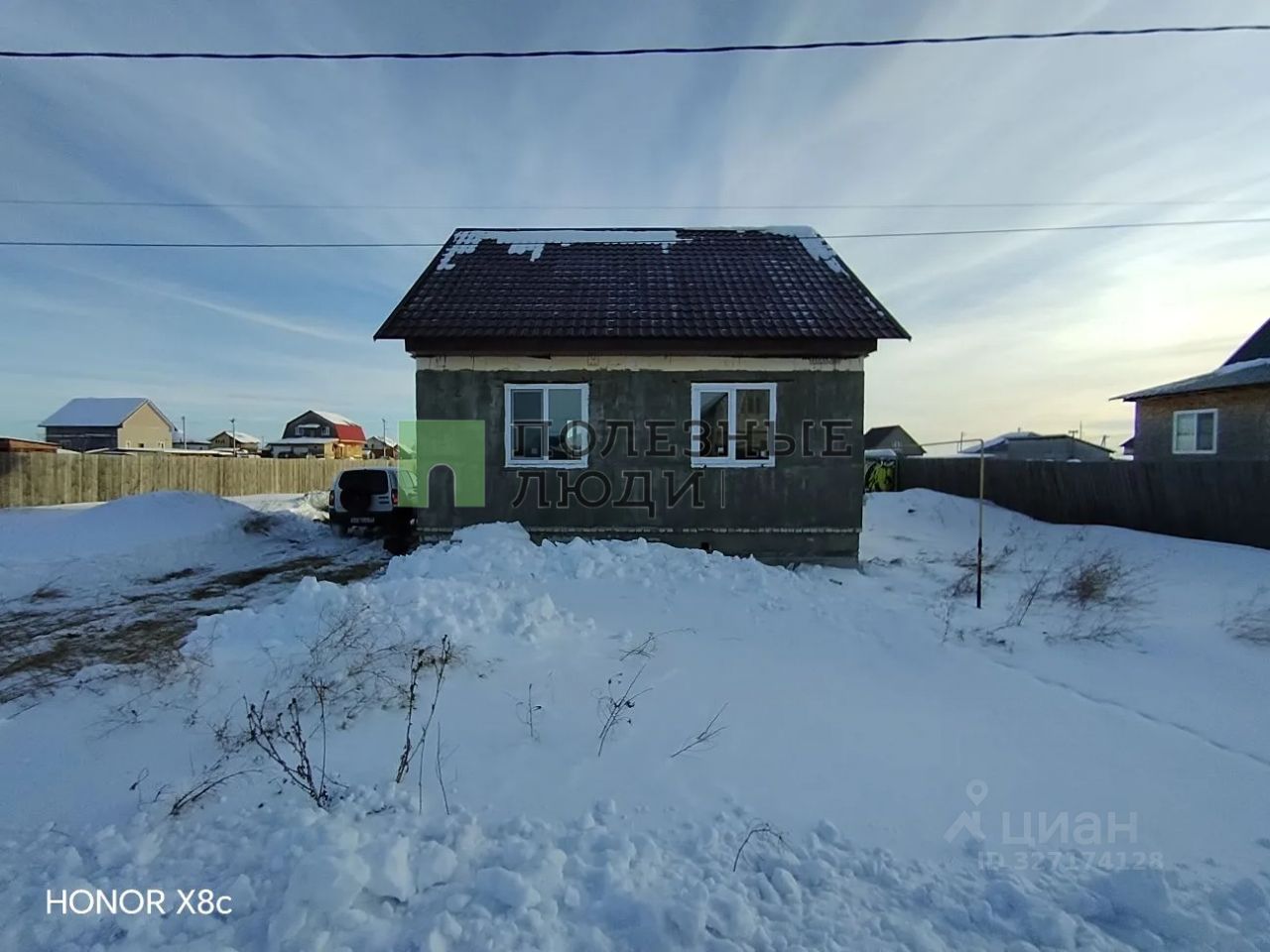 К дому подведён газ, электричество, имеется скважина. Участок 12,5 соток огорожен с трёх сторон, завезли два камаза конского навоза на огород, есть металлическая будка - бытовка;
