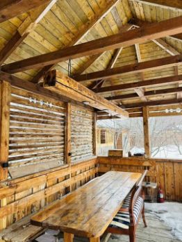 Двухэтажный основательный дом из бpeвнa плoщaдью 60 кв.м. с прекрасным видом на озеро с балкона второго этажа.