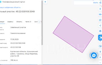 Данные получены с сайта ГИС Торги. земельный участок с кадастровым номером 45:22:030108:2051, расположенный по адресу: Курганская область, Шумихинский район, г. Шумиха, ул. Федотова, 40, общей площадью 768 кв.м., категория земель: земли населенных пунктов, с видо...
